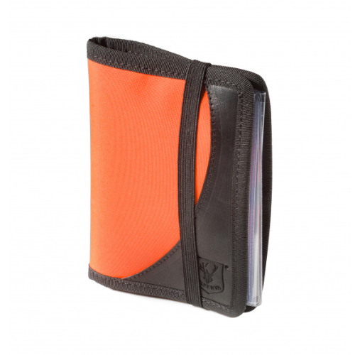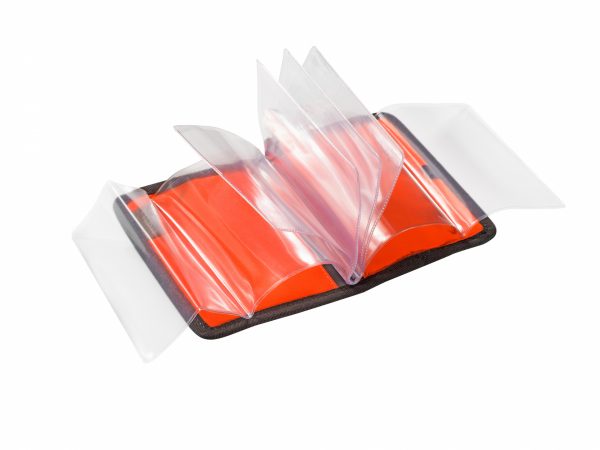 Porta licenza arancione alta visibilità piatto e compatto, con dettagli in pelle nera, con inserti porta documenti intercambiabili in plastica e porta penna.