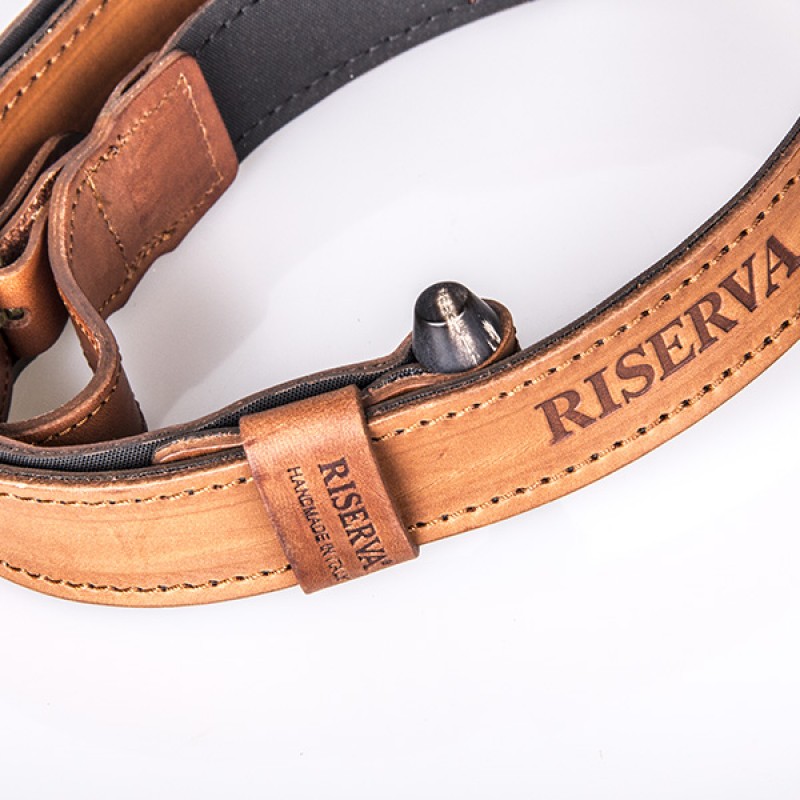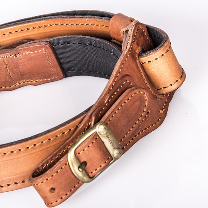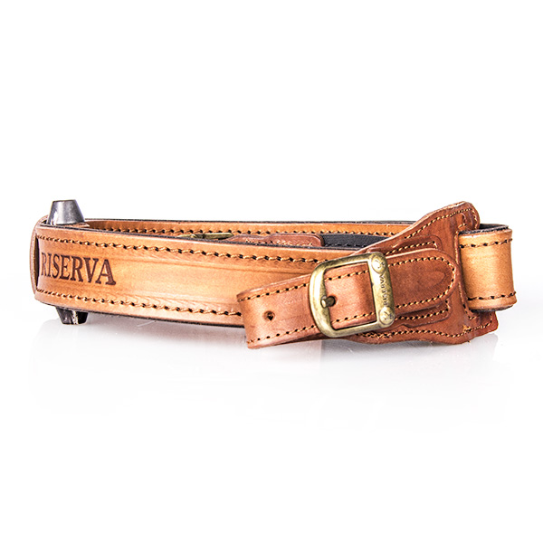 Tracolla a regolazione rapida in pelle conciata al vegetale, munita di corno di bufalo e carrellino scorrevole, per accorciare la tracolla durante il tiro e limitarne l’ingombro.