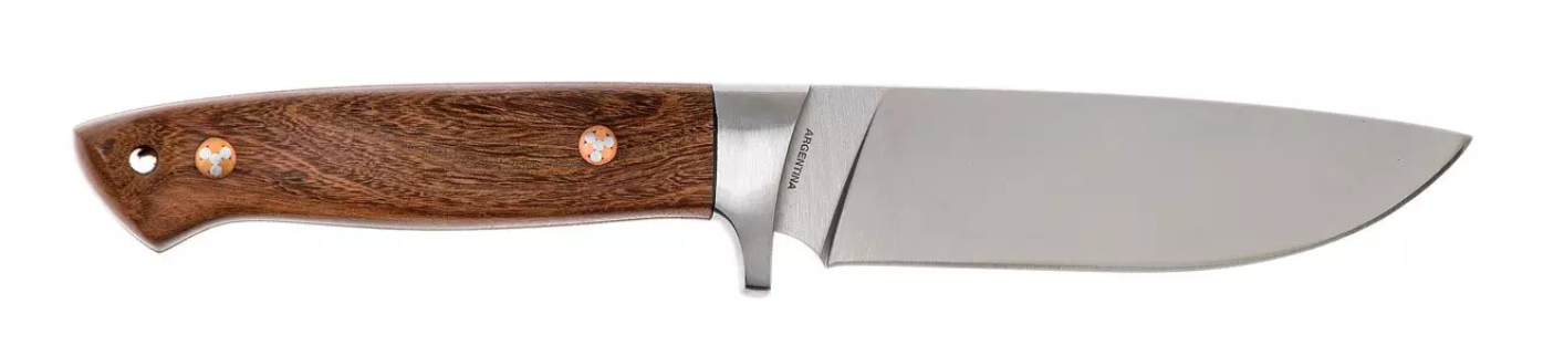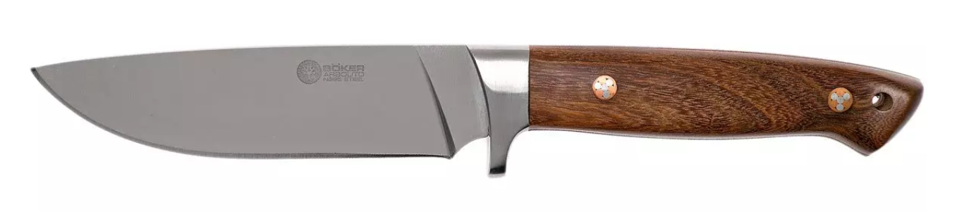Il Böker Arbolito Trapper è un coltello da caccia di bella forma, fatto dal dipartimento argentino Arbolito di Böker. La lama è realizzata in acciaio Böhler N695, Questa è la versione austriaca del famoso acciaio 440C. La forma è perfetta per sventrare la selvaggina. Il dorso è ben arrotondato, proprio come le forme voluttuose del manico. Si può vedere che il coltello è fatto con fascino sudamericano. La mano del maestro è chiaramente visibile.